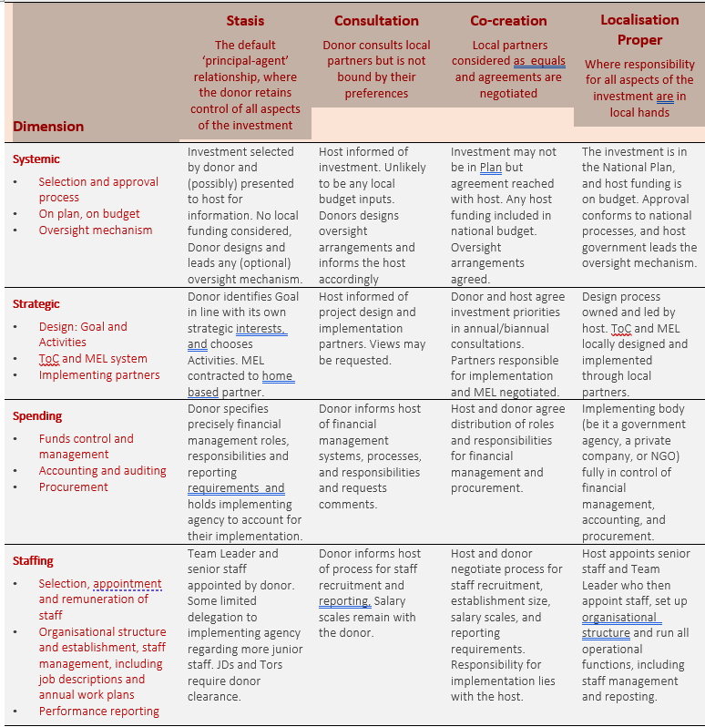 • Localisation Proper: where full power and authority over all aspects of the project are passed to the host or its chosen implementing agent