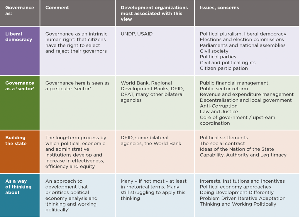 - First, ‘governance’ covers a variety of institutions, all of which can contribute to better governance and a more effective state. The World Bank tracks six such institutions: government effectiveness, regulatory quality, voice and accountability, political stability and the absence of violence, the rule of law, and anti-corruption5. Thus when we speak of governance, we need to be clear to which specific sets of institutions we are referring.