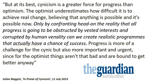 Once I understood this, other things followed. First, I realised that the rules of the game create powerful sets of incentives to which people, individually and collectively, respond. Given human nature and the urge to survive and thrive, the usual human response is to protect or extend one’s own interests, rather than to promote the public good. Up to that point I had naïvely believed governments existed to promote the common weal. I was learning to become more cynical, as Julian Baggini, the British philosopher urges us all to be.