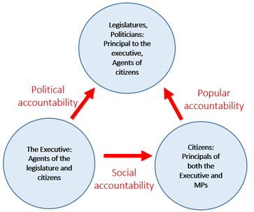 We can apply this idea collectively. As politician are accountable to citizens, they become their Agent. Similarly with regard to the executive: they are accountable to both citizens and minister / the legislature. They are the Agents of both.