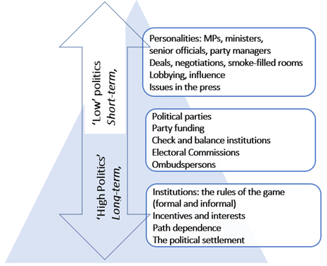 By contrast governance advisers on the development side of the house look at politics structurally: how the political structure affects elite formation, the nature of the political settlement (a big idea that did not really arrive until ten or so years ago) and the nature of the social contract. They look at ‘deep structures’ – the historical institutions that influence if not determine individual and collective behaviour. This is high politics.