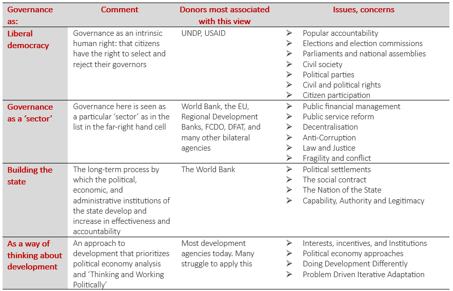 Since 1997 the understanding of governance has matured. ‘Governance’ has now come to be thought of in different ways. It is not merely a ‘sector’, like education or health. I suggest that there are now four different interpretations of governance, and they are not mutually exclusive. The figure below summarises these interpretations and which donors are most associated with each view.